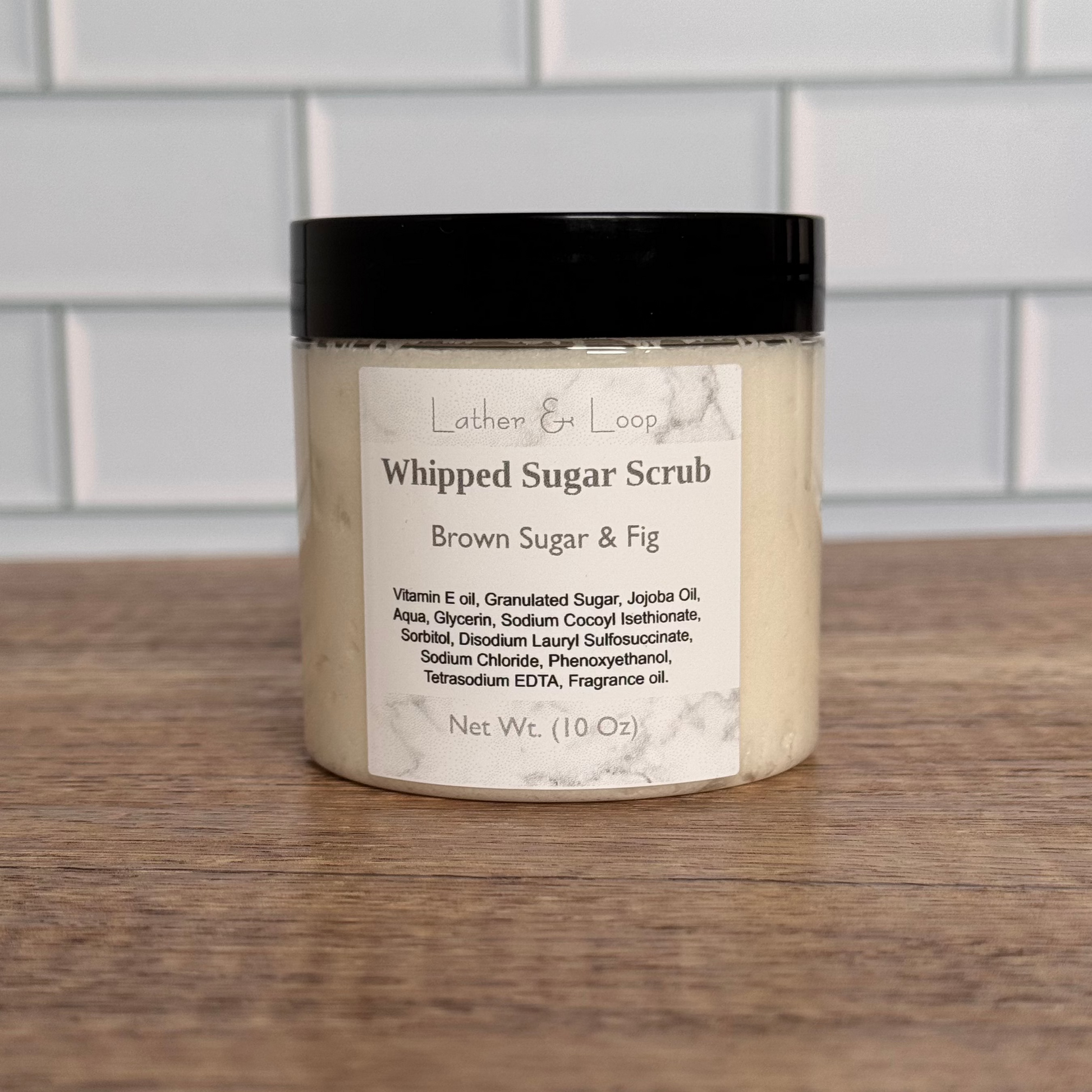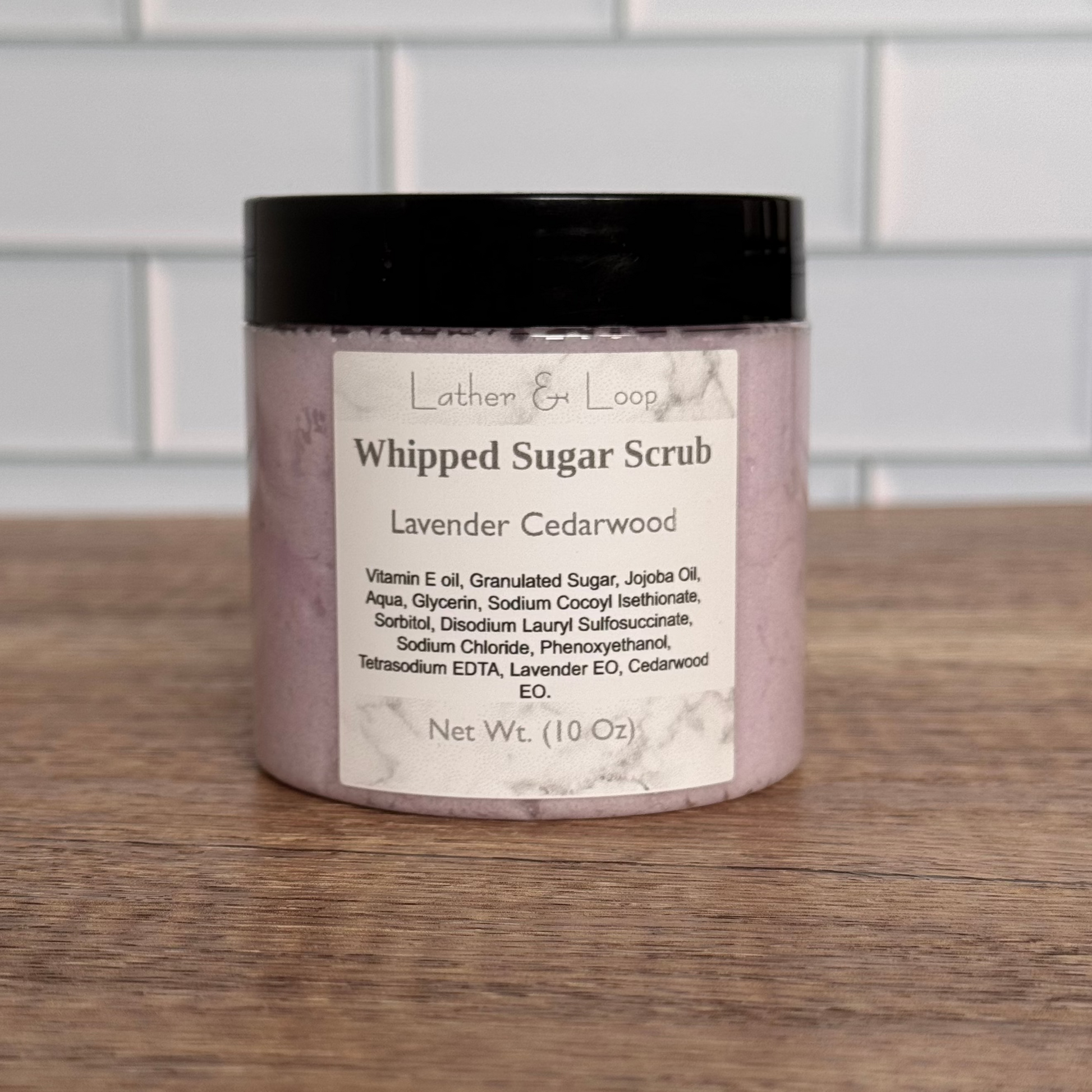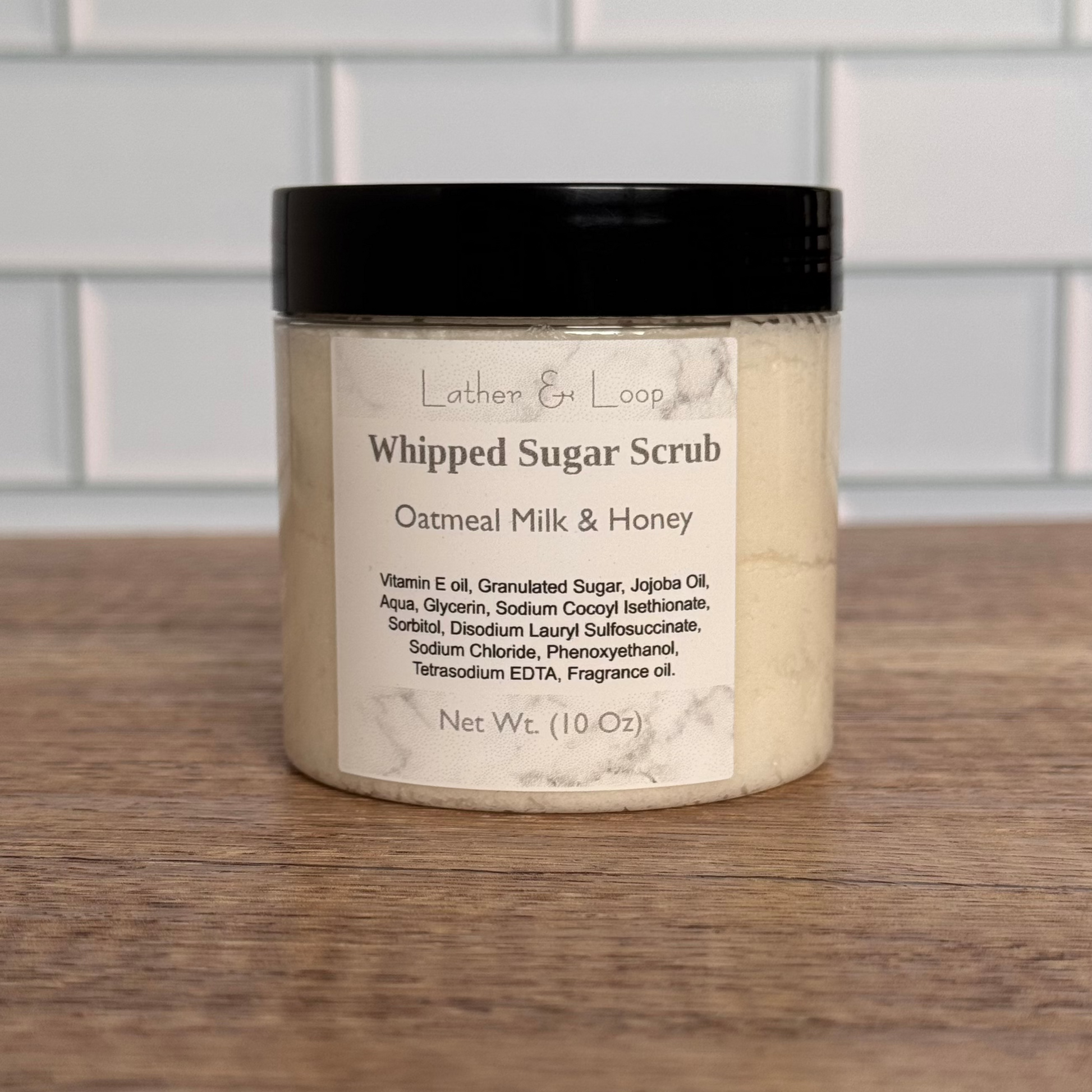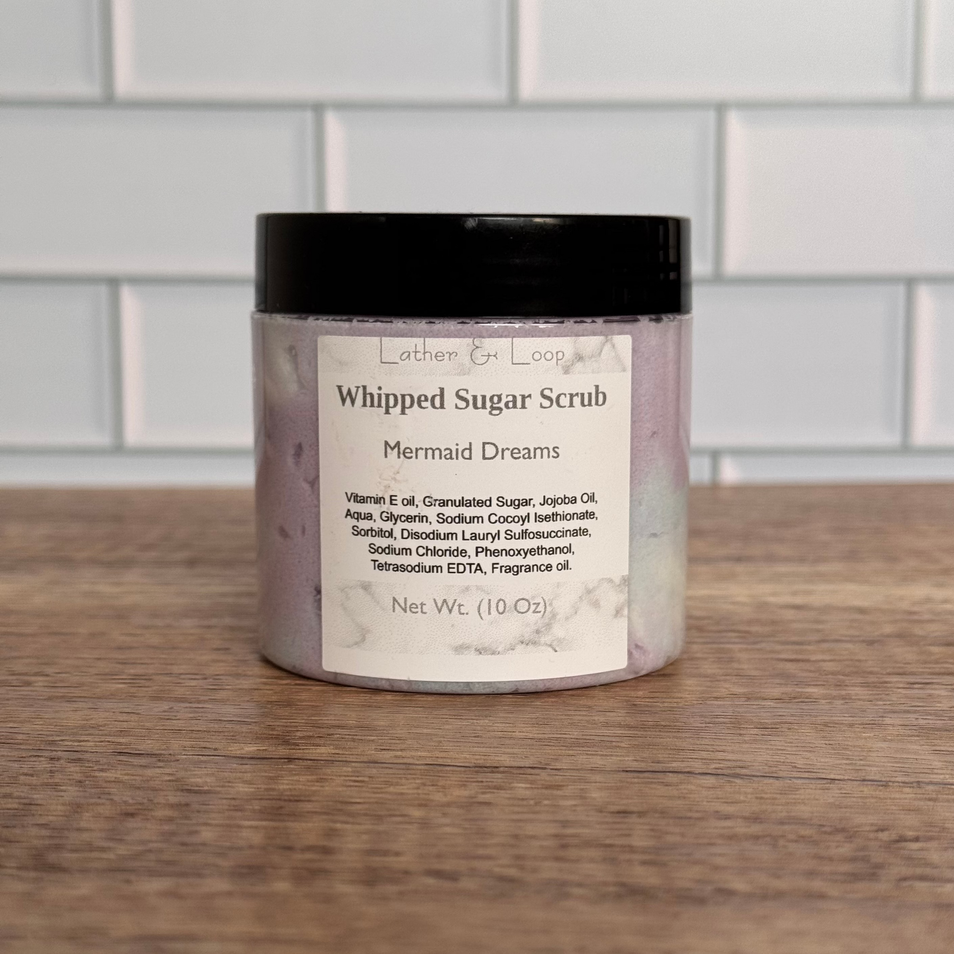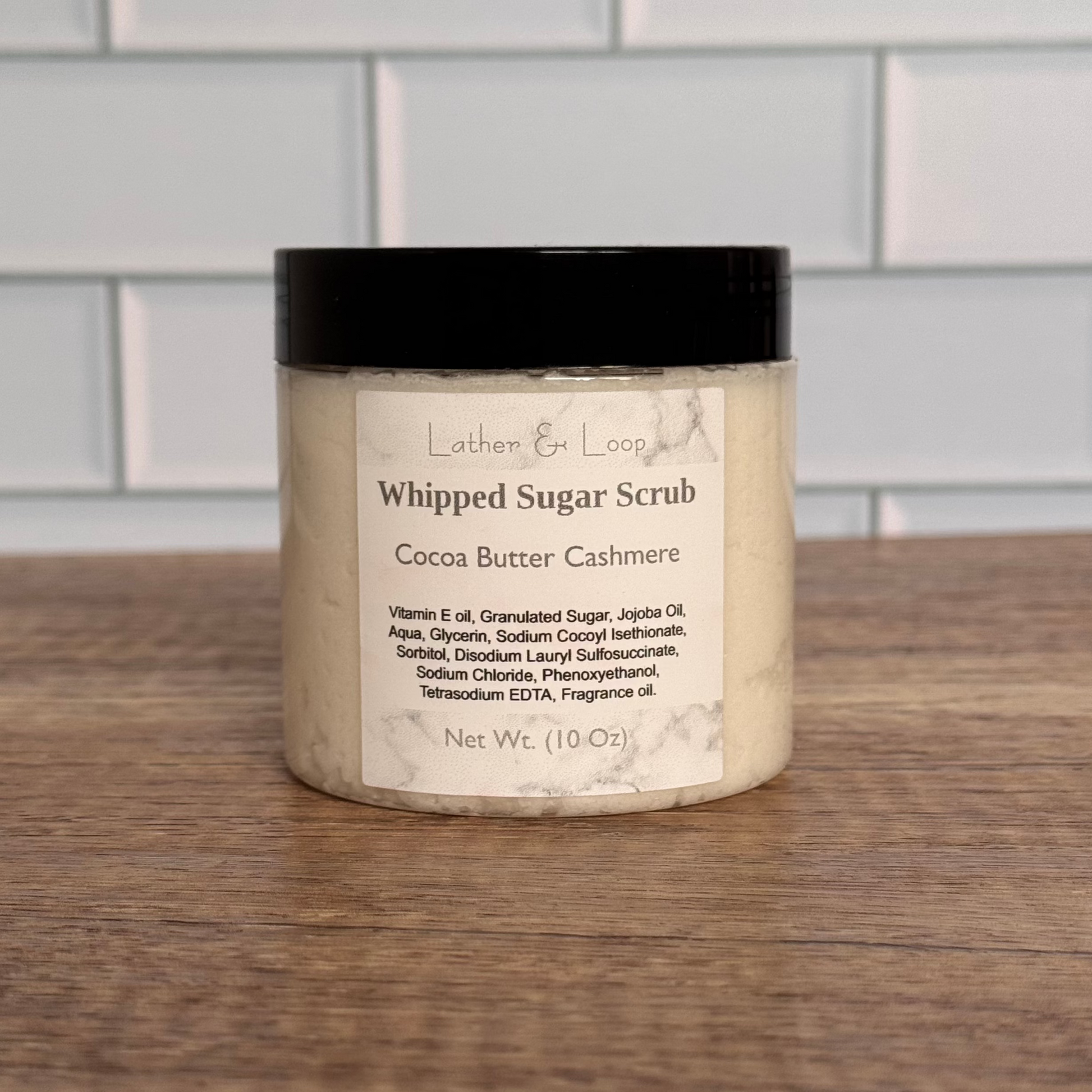 Granulated Sugar, Vitamin E oil, Jojoba oil, Aqua, Glycerin (Vegan), Sodium Cocoyl Isethionate (Coconut Derived), Sorbitol, Disodium Lauryl Sulfosuccinate, Sodium Chloride, Phenoxyethanol, Tetrasodium EDTA, Fragrance Oil.